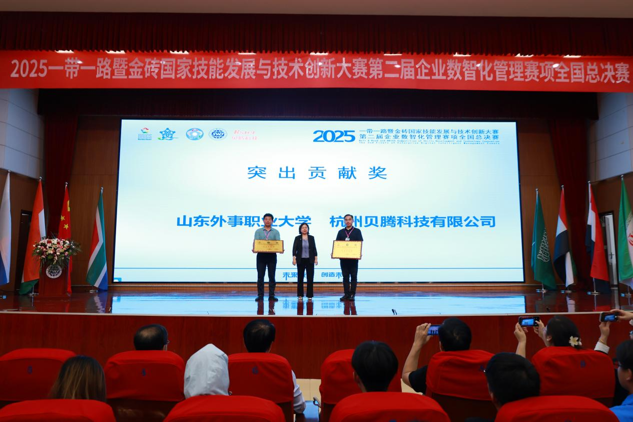 大赛还设立了突出贡献奖,表彰对大赛做出突出贡献的单位。杭州贝腾科技有限公司作为承办单位,凭借出色的组织工作和全方位的赛事保障,获得此项荣誉。山东外事职业大学也因对大赛的重要贡献同时获得该奖项。金砖国家技能发展与技术创新大赛组委会执委会竞赛办公室二处处长何美连为获奖单位颁奖。
