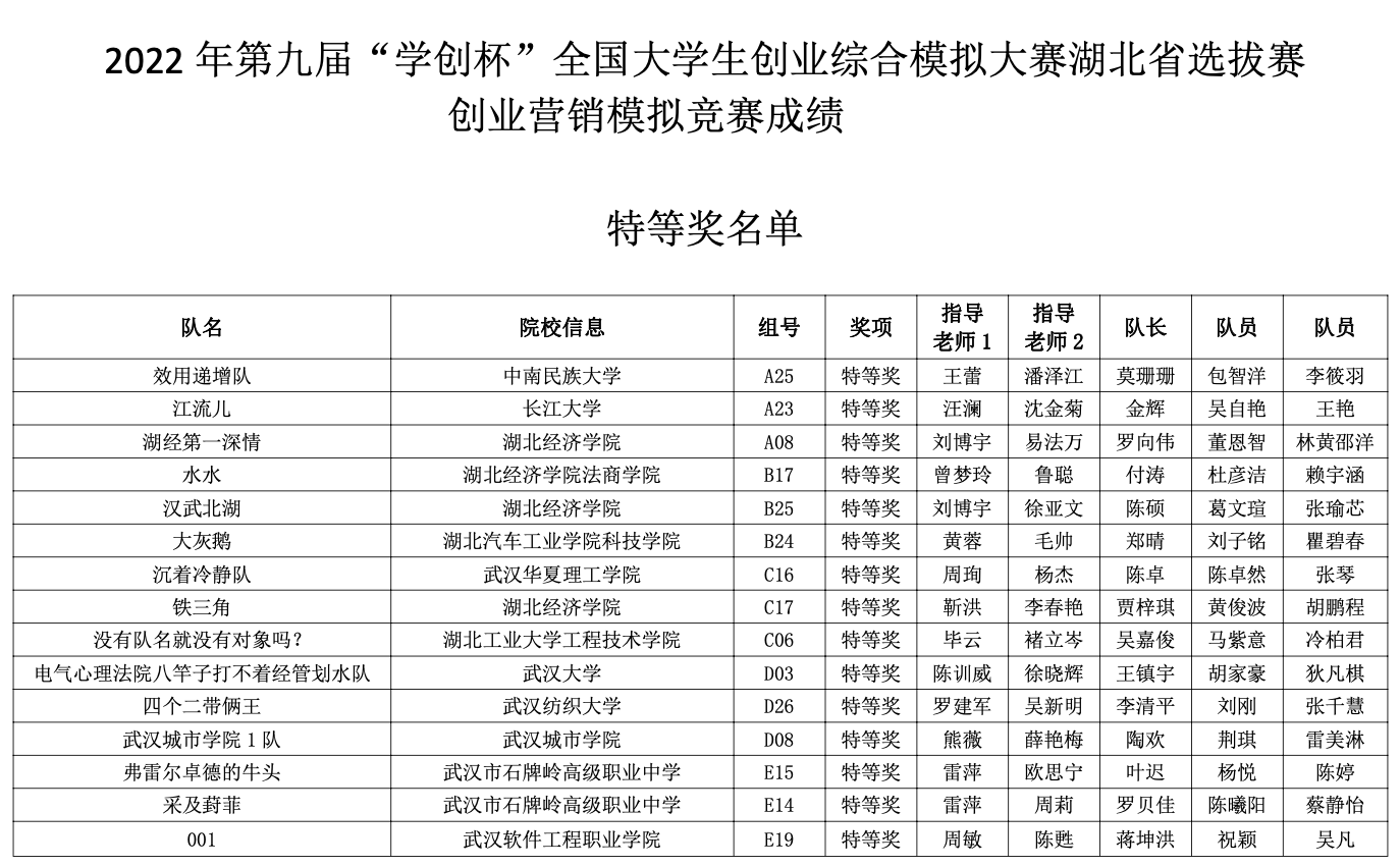 2022年“学创杯”全国大学生创业综合模拟大赛湖北省选拔赛共有120所院校、362支团队参与,按照竞赛结果及规则,现对拟获奖团队进行网上公示,公示期为6月6日-6月8日。公示期间,如有异议,请联系湖北赛区组委会负责人。