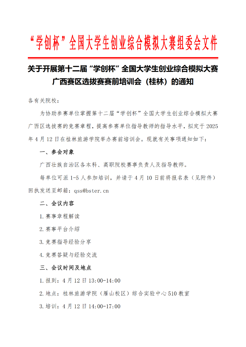 关于开展第十二届“学创杯”全国大学生创业综合模拟大赛广西赛区选拔赛赛前培训会(桂林)的通知