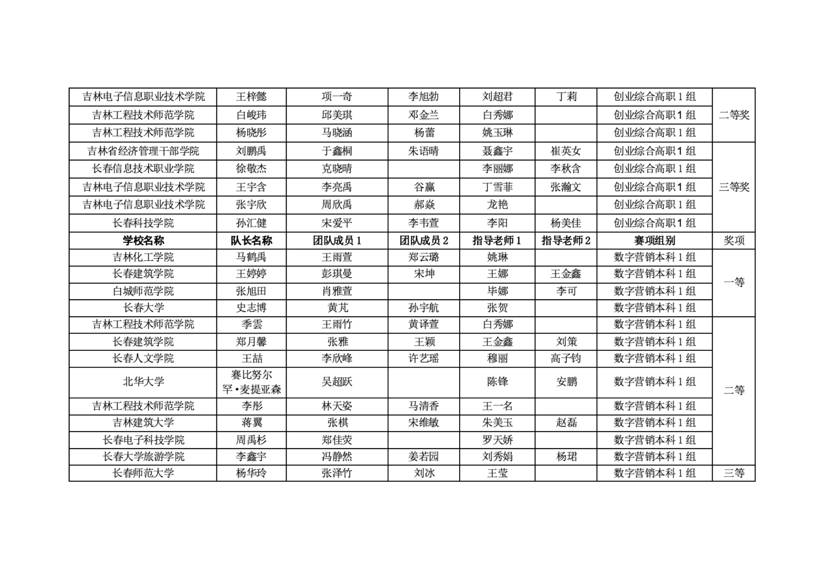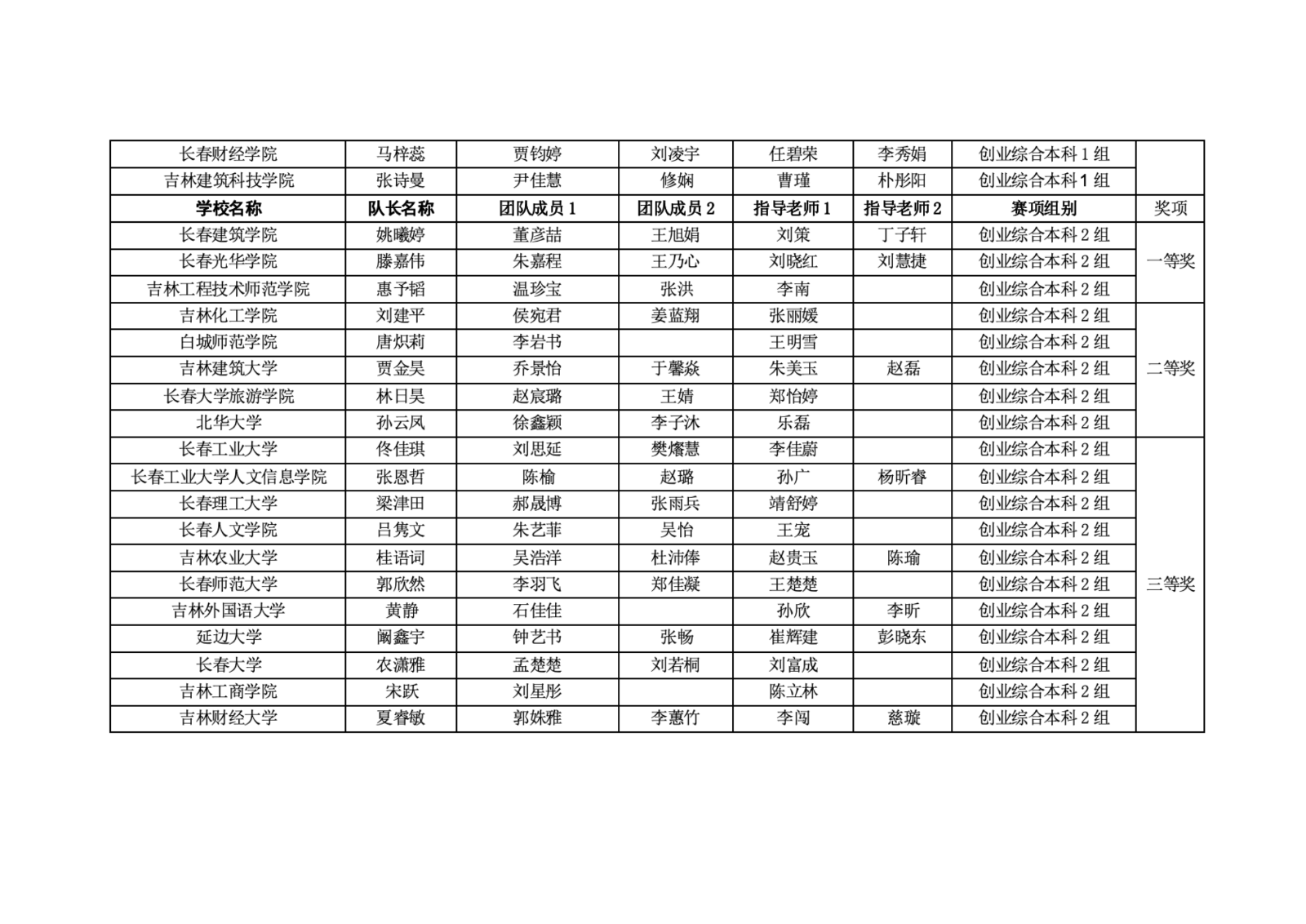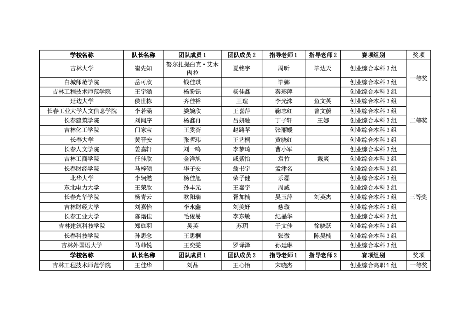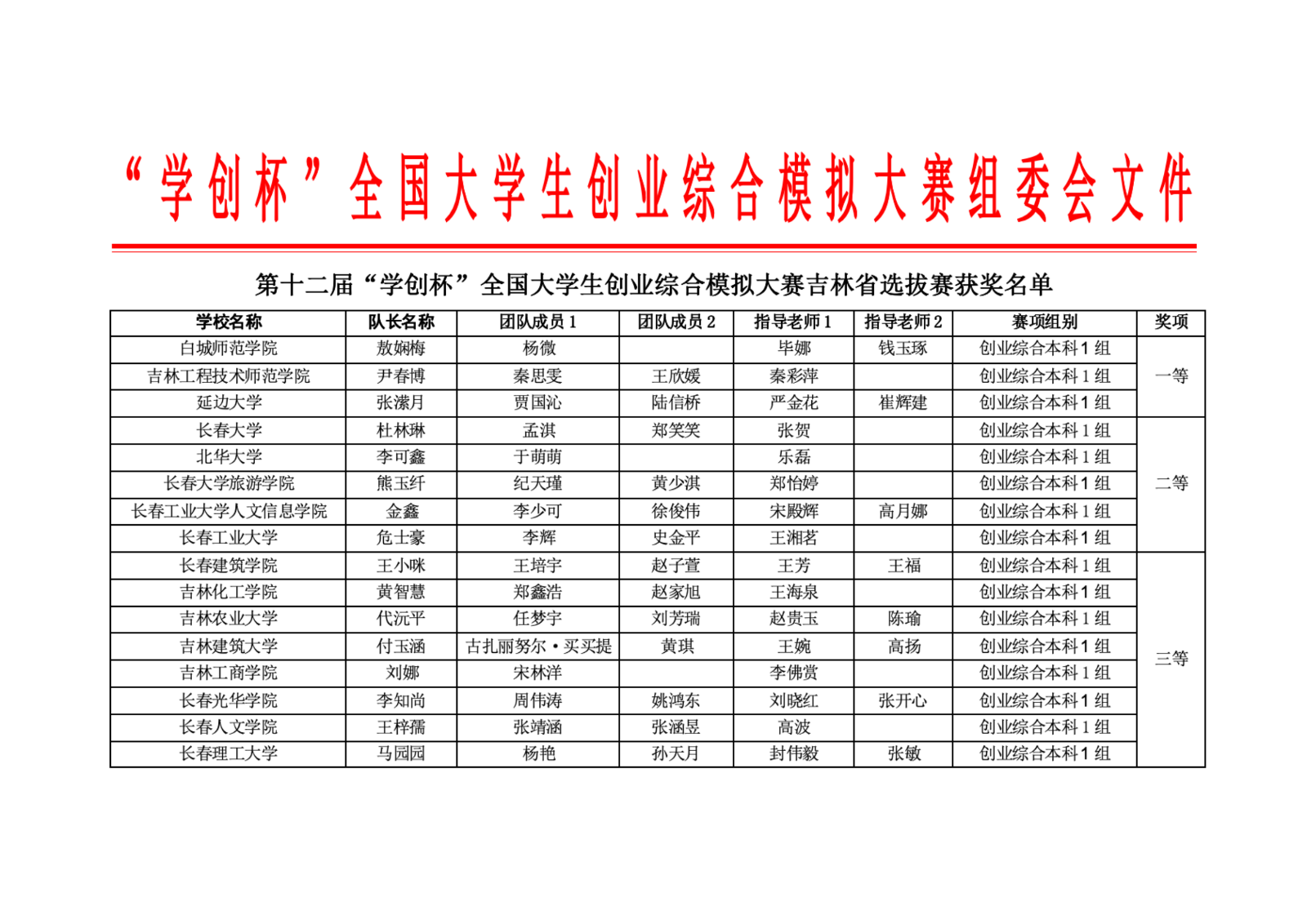 第十二届“学创杯”全国大学生创业综合模拟大赛吉林省选拔赛获奖名单