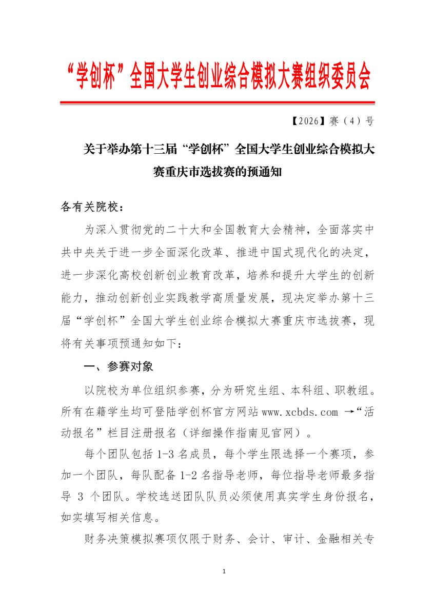 关于举办第十三届“学创杯”全国大学生创业综合模拟大赛重庆市选拔赛的预通知