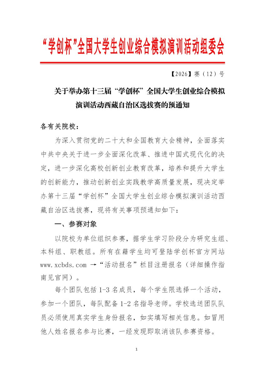 关于举办第十三届“学创杯”全国大学生创业综合模拟演训活动西藏自治区选拔赛的预通知