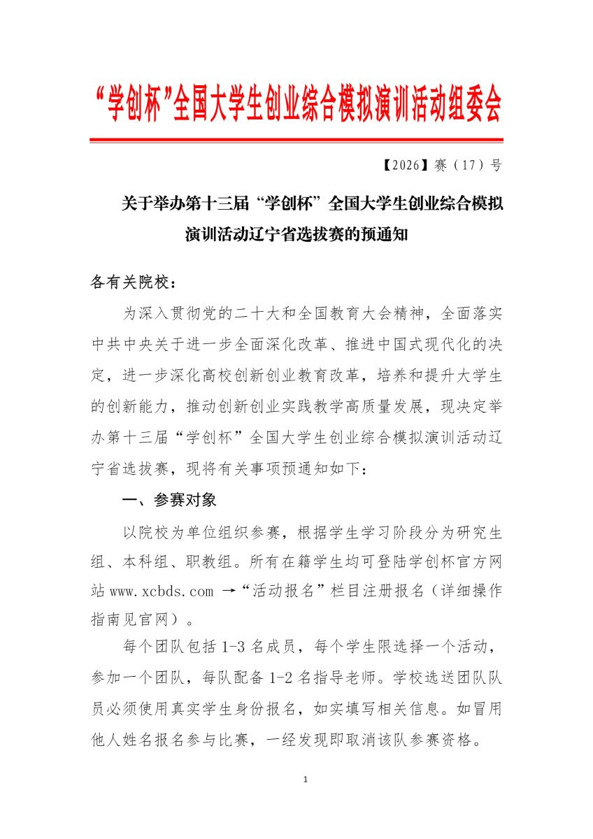 关于举办第十三届“学创杯”全国大学生创业综合模拟演训活动辽宁省选拔赛的预通知