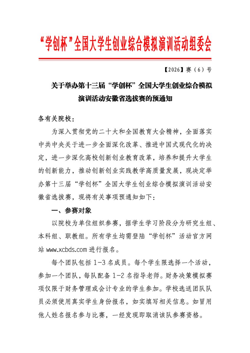 关于举办第十三届“学创杯”全国大学生创业综合模拟演训活动安徽省选拔赛的预通知