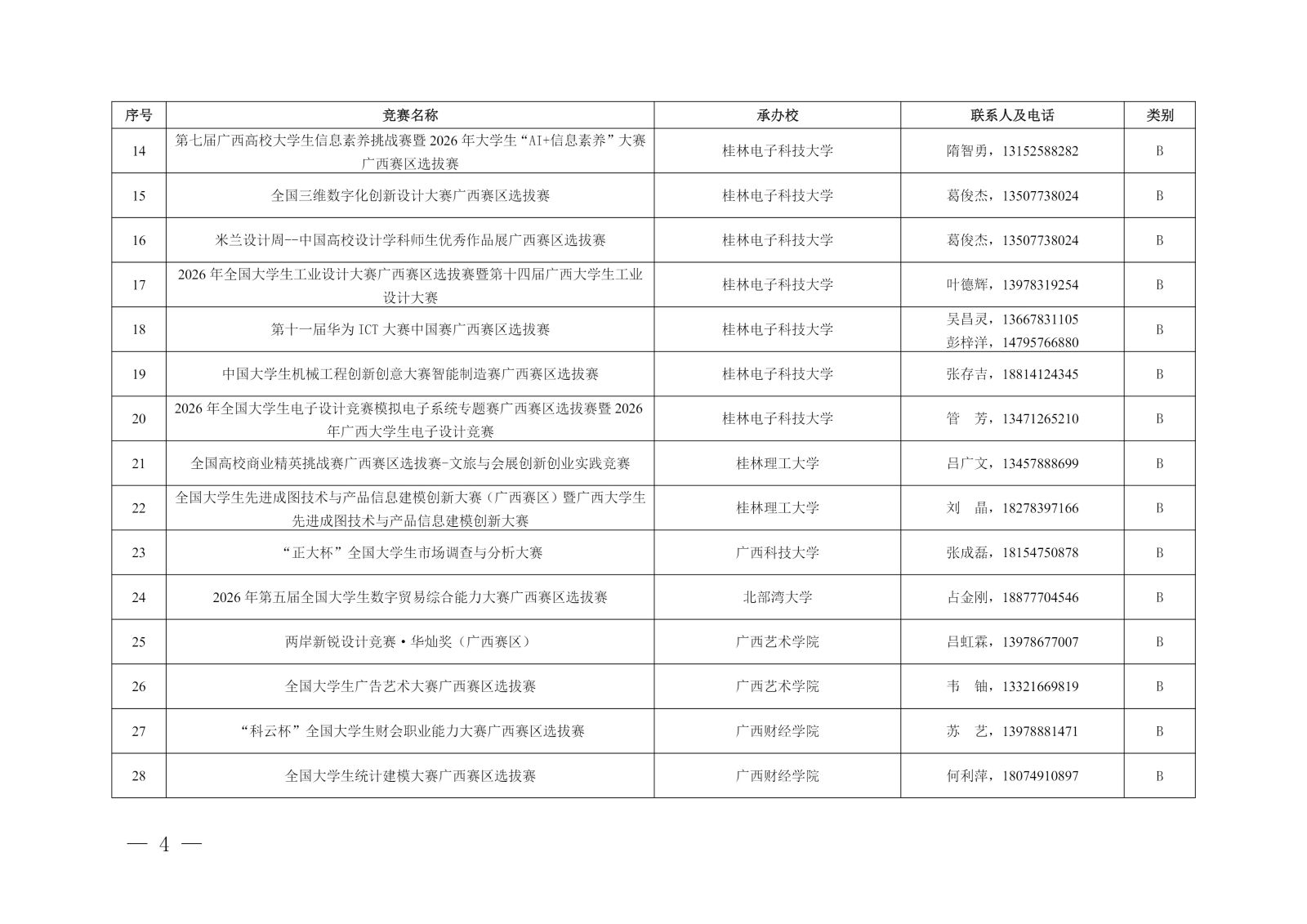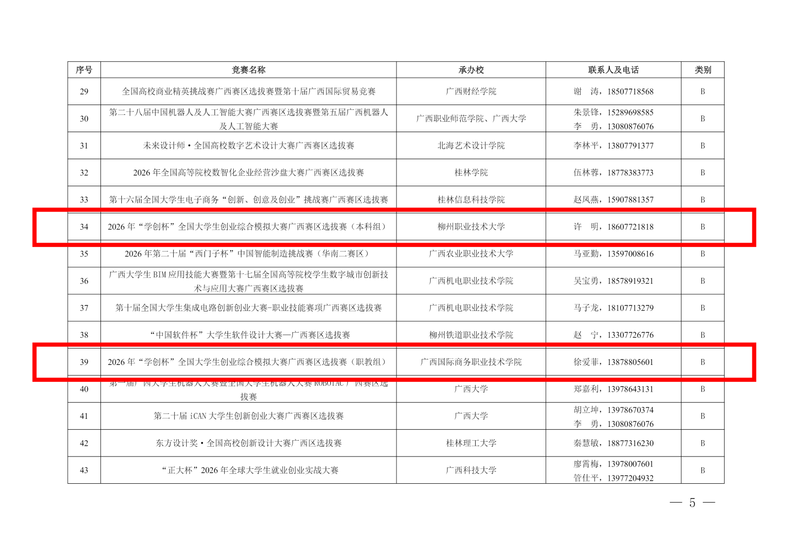 本次入选的 2026 年 “学创杯” 全国大学生创业综合模拟大赛广西赛区选拔赛,本科组由广西本科高校经济与贸易类教学指导委员会和柳州职业技术大学承办、广西高等教育学会新商科实验教学专业委员会协办,职教组由广西商贸职业教育指导委员会和广西国际商务职业技术学院承办。