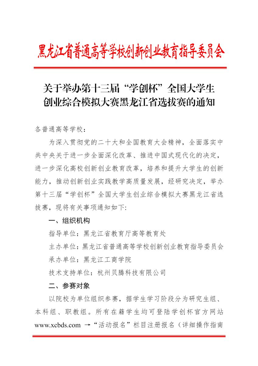 关于举办第十三届“学创杯”全国大学生创业综合模拟大赛黑龙江省选拔赛的通知