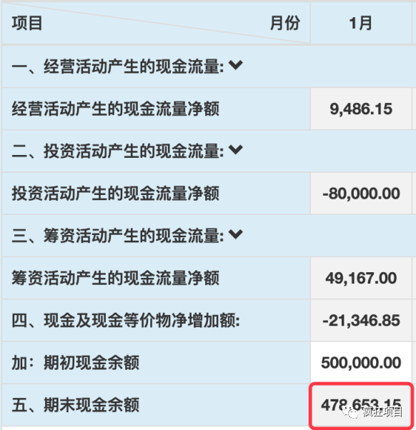 “五、期末现金余额”这一栏显示的是企业手中目前实际累计有多少现金,这个数字就很关键了,如果这个数字是负的,就说明企业账上已经没有一分钱现金了,那么危机也就降临了。